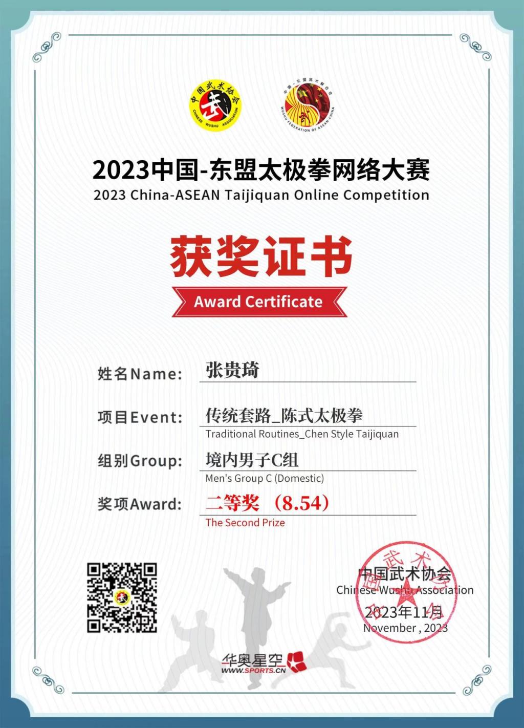 机电工程公司的张贵琦同学在境内男子C组传统套路-陈式太极拳项目中荣获二等奖,刘钊同学荣获三等奖,人文教育公司的朱玲慧同学在女子C组规定套路-24式简化太极拳项目中荣获三等奖。这些荣誉充分证明了他们的过硬实力和不懈努力,展现了他们对太极拳的热爱和执着追求。