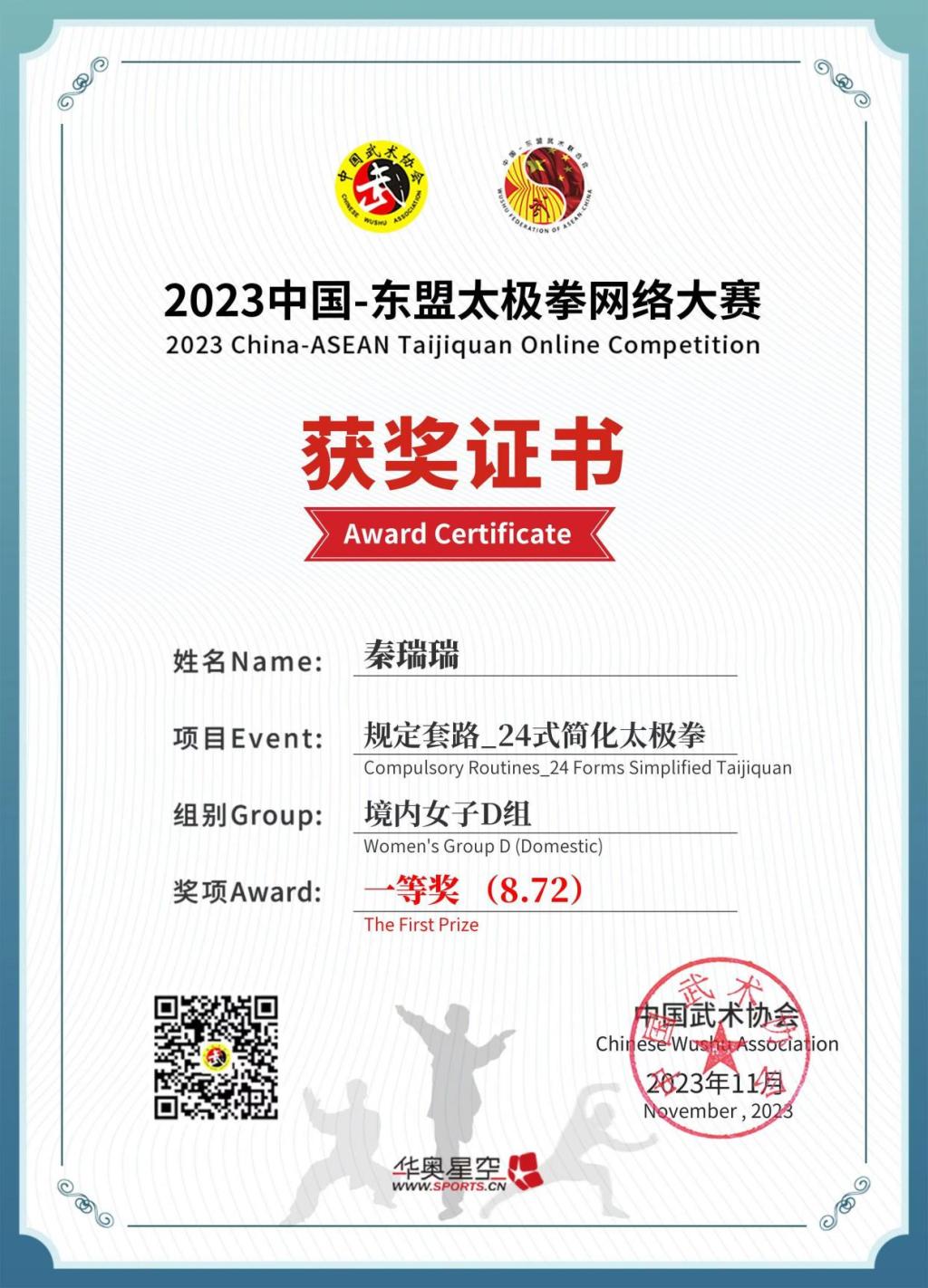 由中国武术协会主办,中国-东盟武术联合会合作举办的2023年中国-东盟太极拳网络大赛于11月22日圆满结束。经过专家严谨的评判,yl9193永利的秦瑞瑞老师在境内女子D组规定套路-24式简化太极拳项目中获得一等奖,传统套路-陈式太极拳项目中获得二等奖。这充分展示了秦瑞瑞老师在太极拳领域的精湛技艺和深厚的武术功底。