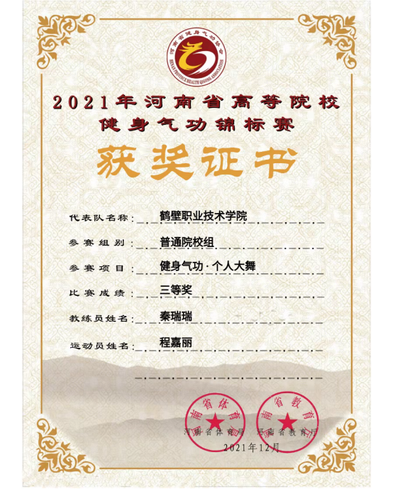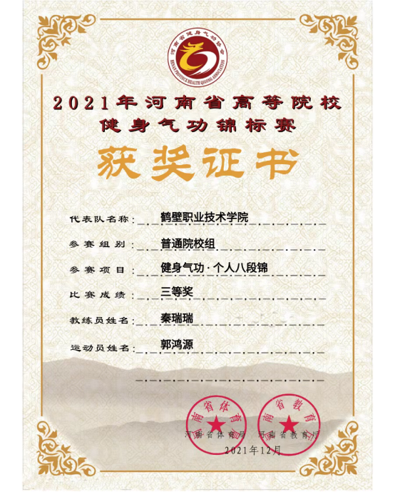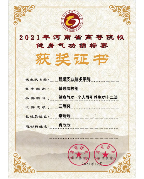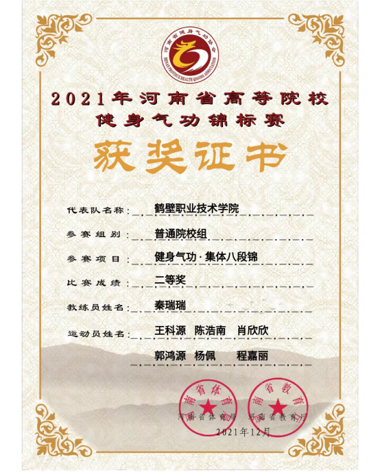 公司参加了普通院校组,参赛选手在秦瑞瑞老师的细心指导下,积极备战。最终获得健身气功·八段锦集体项目二等奖,王科源获得健身气功·个人五禽戏三等奖、郭鸿源获得健身气功·个人八段锦三等奖,程嘉丽获得健身气功·个人大舞三等奖,肖欣欣获得健身气功·个人导引养生功十二法三等奖。