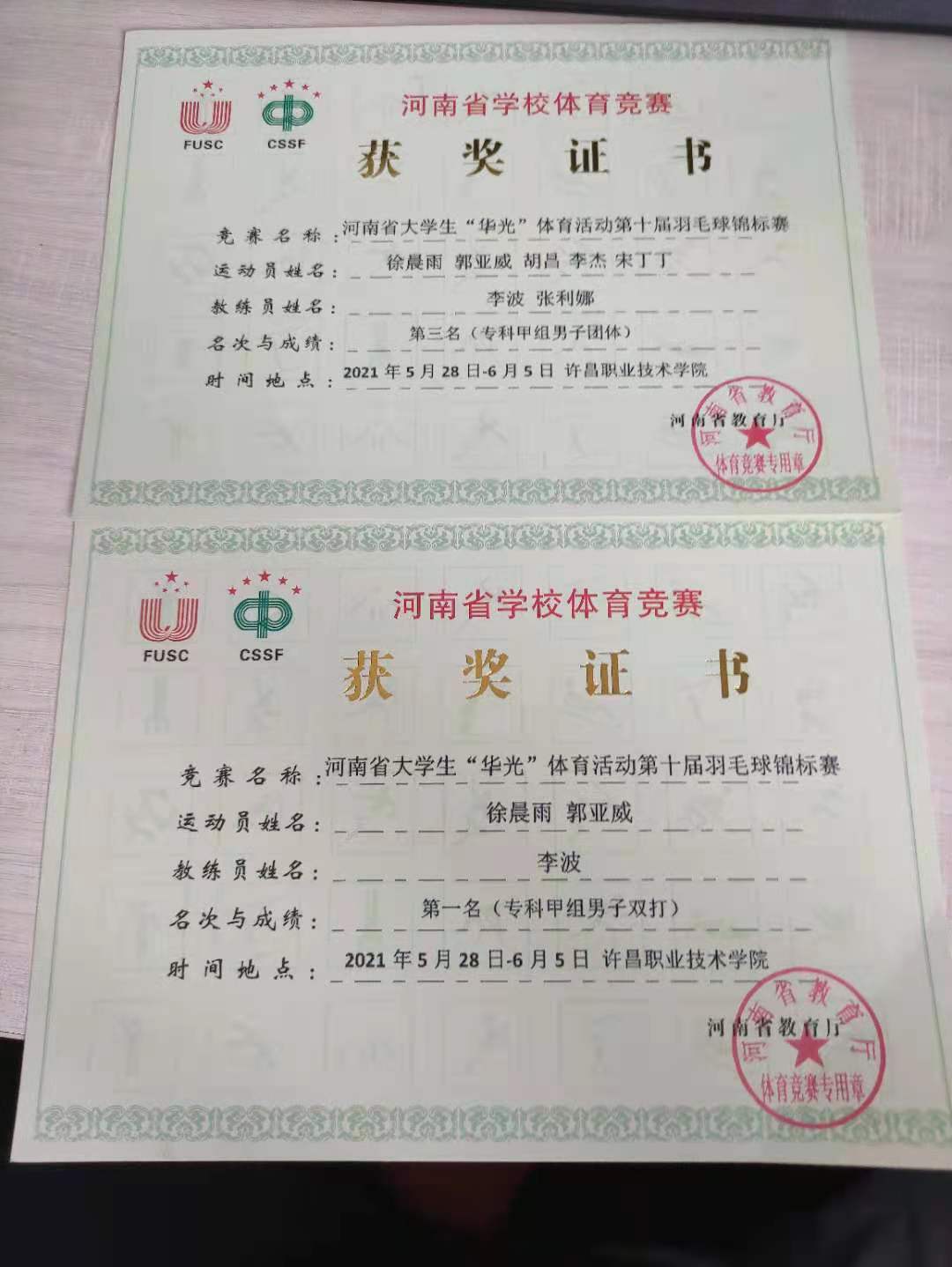 2021年5月28日至6月5日,由河南省教育厅、河南省员工体育总会主办的河南省老员工“华光”体育活动第十届羽毛球锦标赛在许昌职业技术公司举行,来自全省68所高校的563名员工运动员参加了本次比赛。比赛中公司运动员们发扬奋勇拼搏、永不言弃的精神,经过激烈角逐,公司代表队获得专科甲组男子双打第一名、男子团体第三名,李波老师被评为优秀教练员。